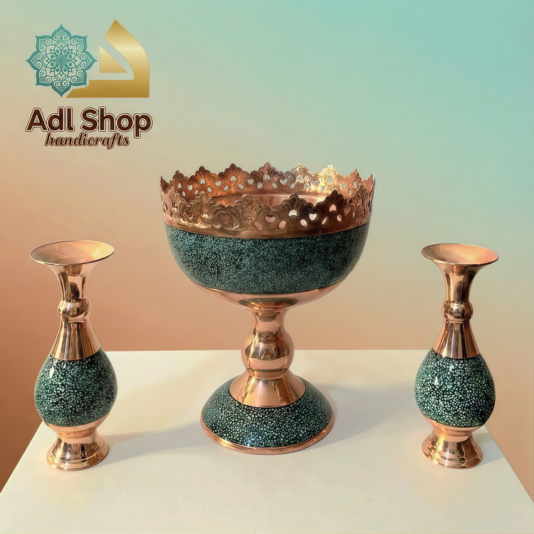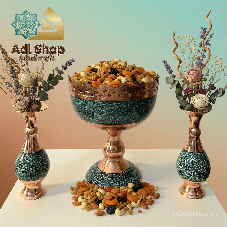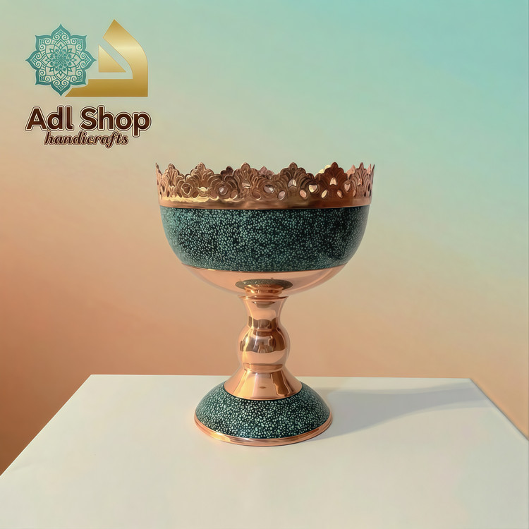 آجیل خوری فیروزه کوبی ظرفی زیبا ونفیس است که از جنس مس و تزئین با سنگ های مرغوب فیروزه ساخته میشود این هنر اصیل اصفهانی ظاهری زیبا به این ظرف میبخشد.